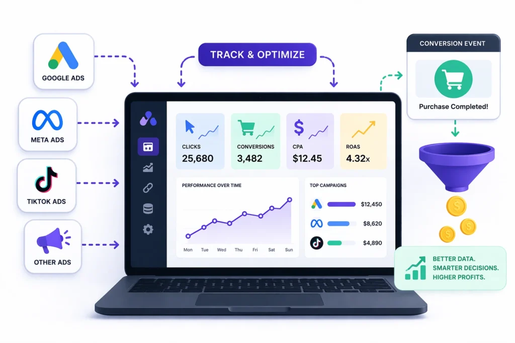 From initial setup to advanced optimization, we ensure your campaigns are tracked with precision so you can make confident, data-driven decisions. Whether youโre running affiliate, eCommerce, or paid traffic campaigns, we help you maximize ROI with reliable tracking.