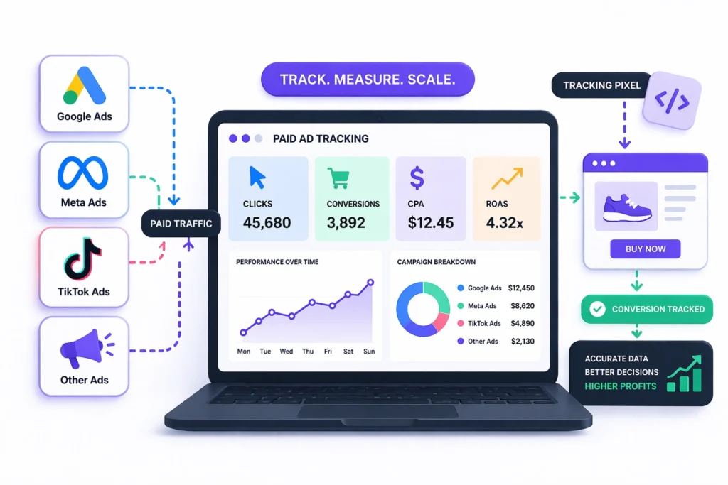 Take full control of your paid advertising performance with advanced tracking systems designed for accuracy and scale. We help you implement precise ad tracking across platforms, eliminate data gaps, and uncover exactly which campaigns, creatives, and audiences are driving real revenueโso you can optimize faster and scale with confidence.